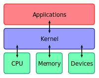 - 커널은 디스크에 파일로써 존재하는 프로그램이며 시스템이 기동 될 때 boot 프로그램에 의해 구동되며 메모리에 상주된다. 기본적으로 프로세스와 파일 관리를 수행하며 그 밖에 입출력 장치관리, 메모리 관리 및 시스템 호출 인터페이스기능을 수행한다. 커널은 메모리, 디스크, 네트워크카드, 비디오 카드 등과 같은 모든 하드웨어를 관리한다. 그리고 응용 프로그램이 이러한 하드웨어를 접근하는 것을 가능하게 해주는 통로가 된다. 응용프로그램의 요청을 받아서 하드웨어 수행을 하고 그 결과를 다시 응용프로그램이 받게 된다.