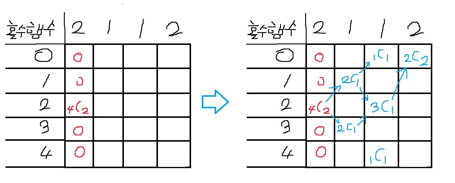 - 현재 가지고 있는 홀수행의 개수를 이용해 다음 열에 있는 1을 배치할 경우, 홀수행을 몇 개 가지고 있는지 계산한다.