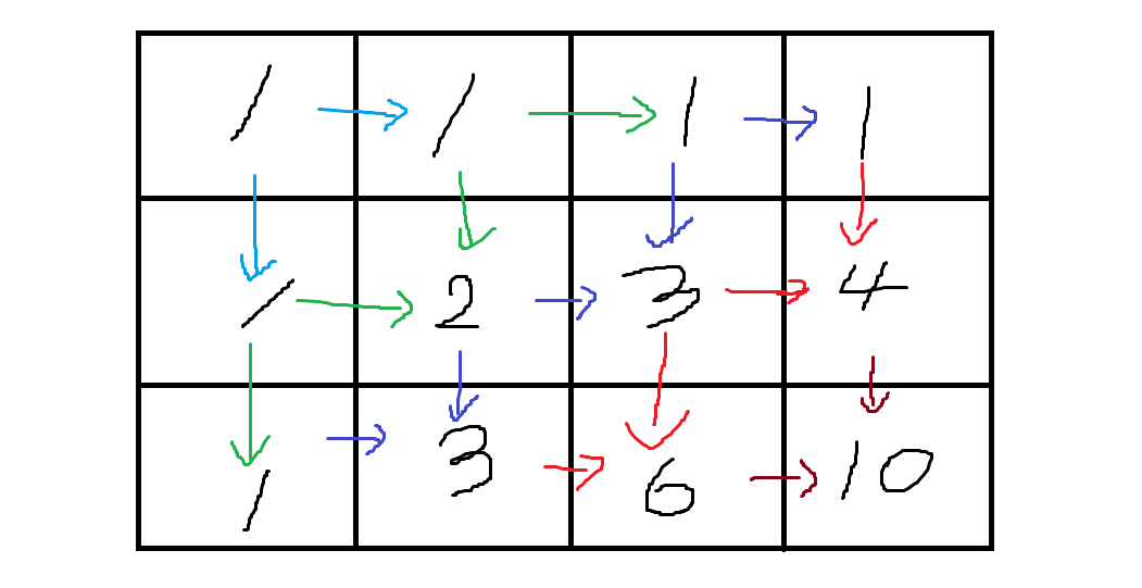 위 그림과 같이 1, 1이 출발지 3, 4가 도착지라고 하면 각 칸까지 이동하는데 걸리는 경우의 수를 나타낼 수 있다.