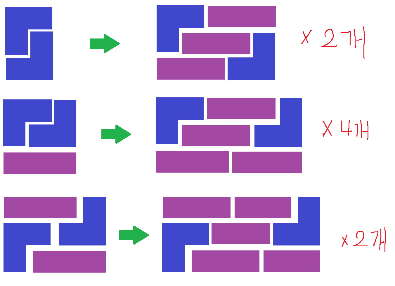 즉, 이러한 타일링 문제는 이전에 네모를 만드는 경우에서(다른 문제의 해결) 추가로 네모 모양을 붙여 경우를 더하는 문제이므로, 고유한 네모를 만드는 방법이 핵심이다.
