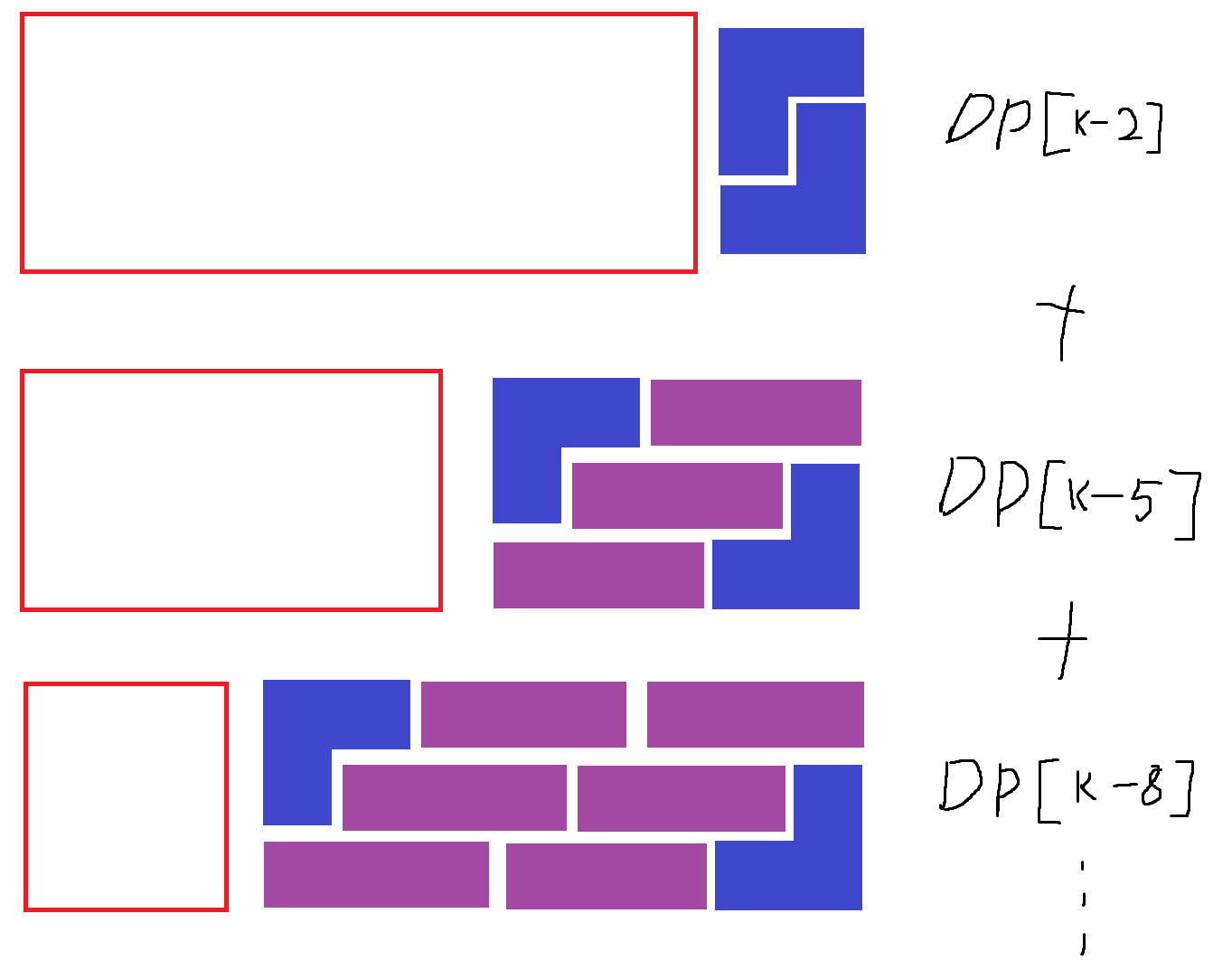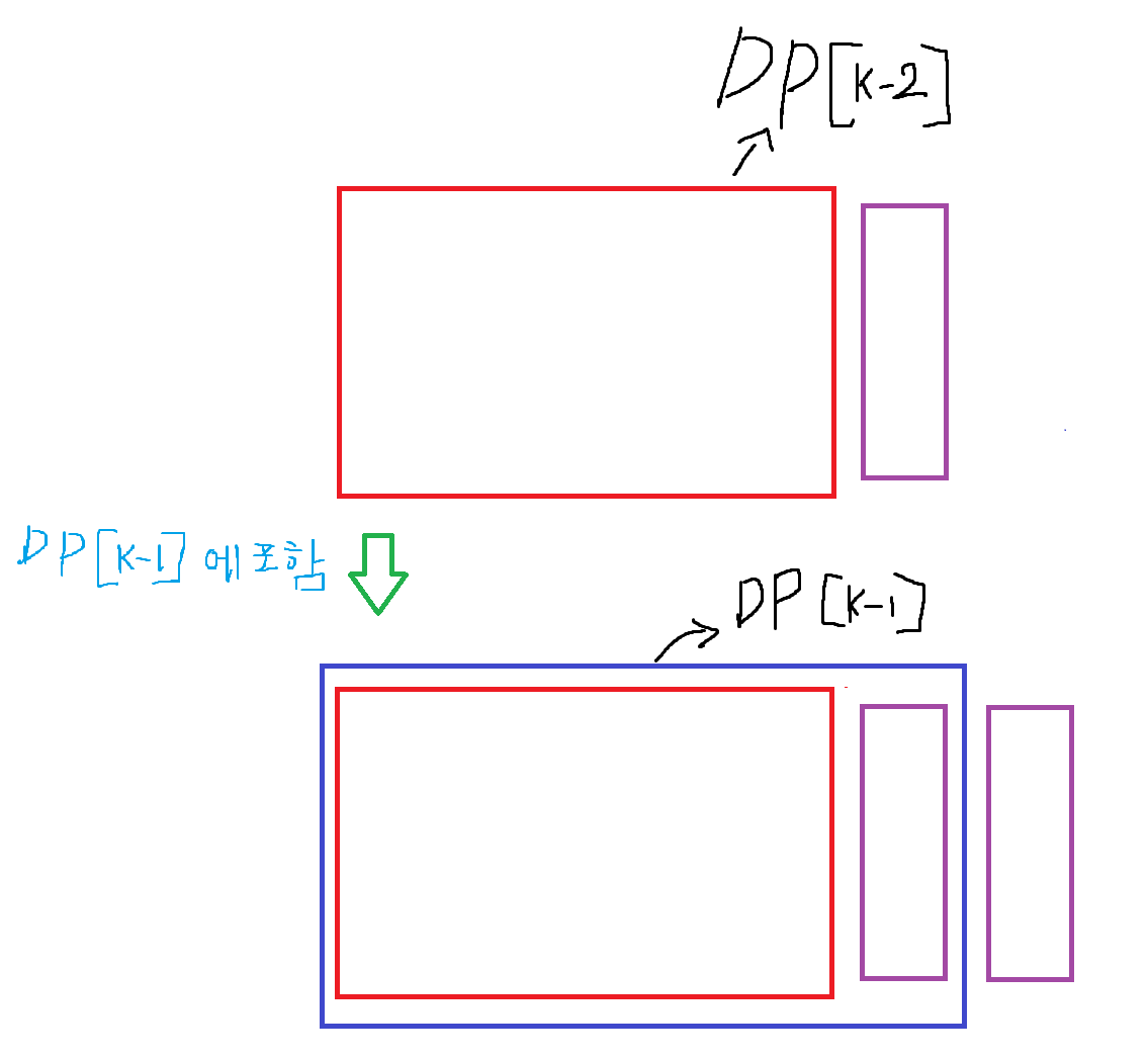 위 그림을 보면 DP[k-1]을 만들 때, DP[k-2]에 막대를 하나 붙인 경우를 포함했으므로, 막대가 2개 있는 경우는 따로 계산하지 않아도 된다.