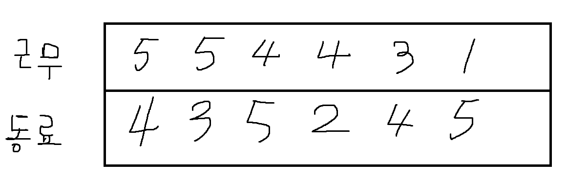 처음에 근무평가가 같은 사람중에 동료평가가 높은 경우를 고려하지 않았다.