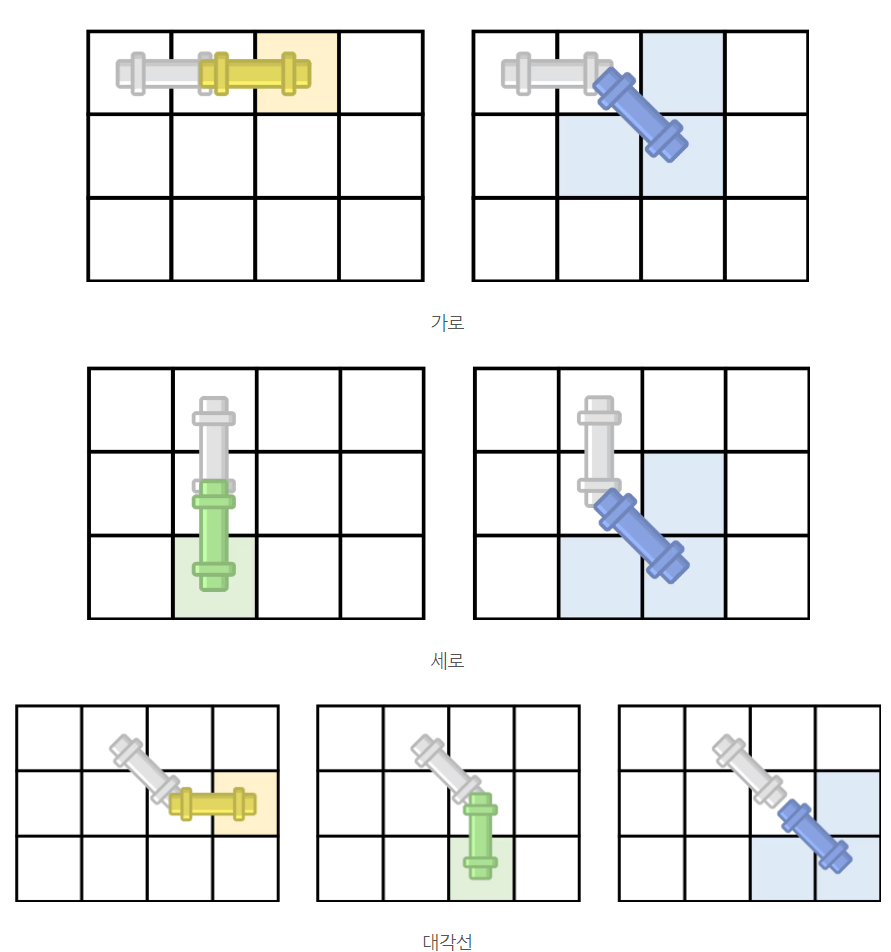 파이프가 가로로 놓여진 경우에 가능한 이동 방법은 총 2가지, 세로로 놓여진 경우에는 2가지, 대각선 방향으로 놓여진 경우에는 3가지가 있다.