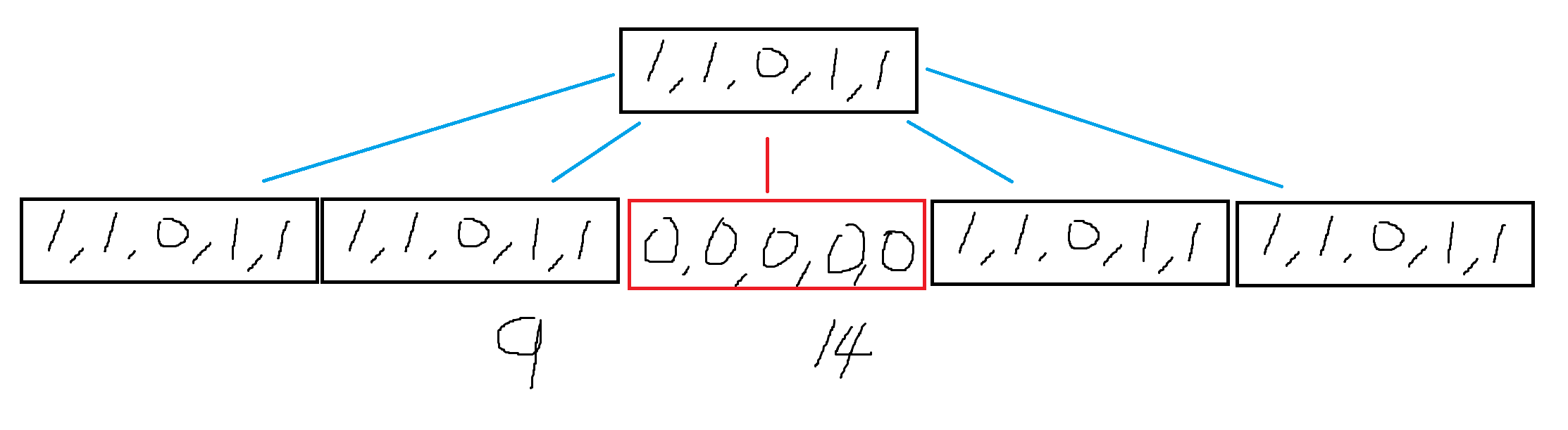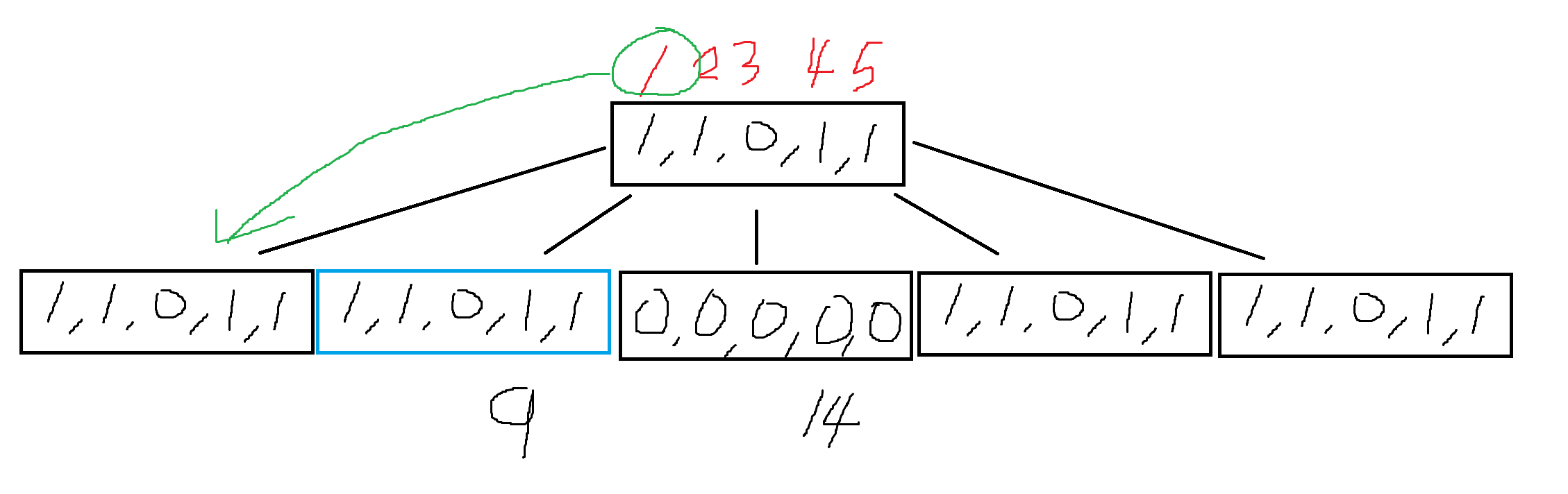 이를 이용해 구간 [9, 14]의 1의 개수는 8-7=1 임을 계산 할 수 있다.
