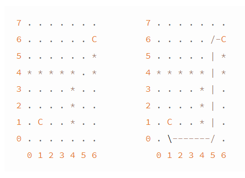 아래 그림은 H = 8, W = 7인 경우이고, 빈 칸은 '.', 벽은 '*'로 나타냈다. 왼쪽은 초기 상태, 오른쪽은 최소 개수의 거울을 사용해서 두 'C'를 연결한 것이다.