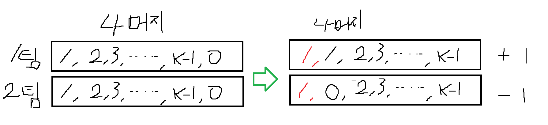 각 팀의 나머지의 합은 K*(K-1)/2로 쉽게 구할 수 있다.