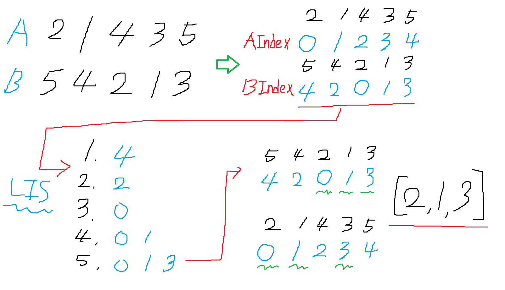 이를 이용하면 A 수열을 기준으로 숫자들은 이미 index가 정렬됐으므로 B 수열의 index가 A수열에서 몇 번째에 등장하는지 기록을 하면 그 기록을 이용해 LIS로 문제를 풀 수 있다. (LIS로 풀면 시간복잡도 O(nlogn)으로 풀 수 있다.)