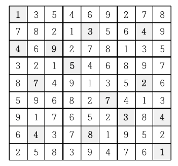 - 굵은 선으로 구분되어 있는 3x3 정사각형 안에도 1부터 9까지의 숫자가 한 번씩만 나타나야 한다.