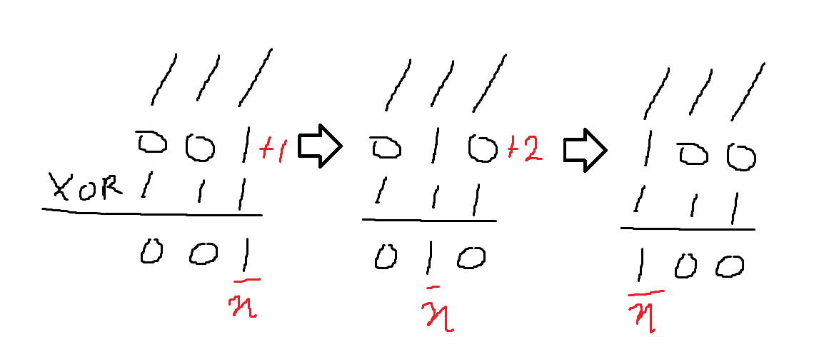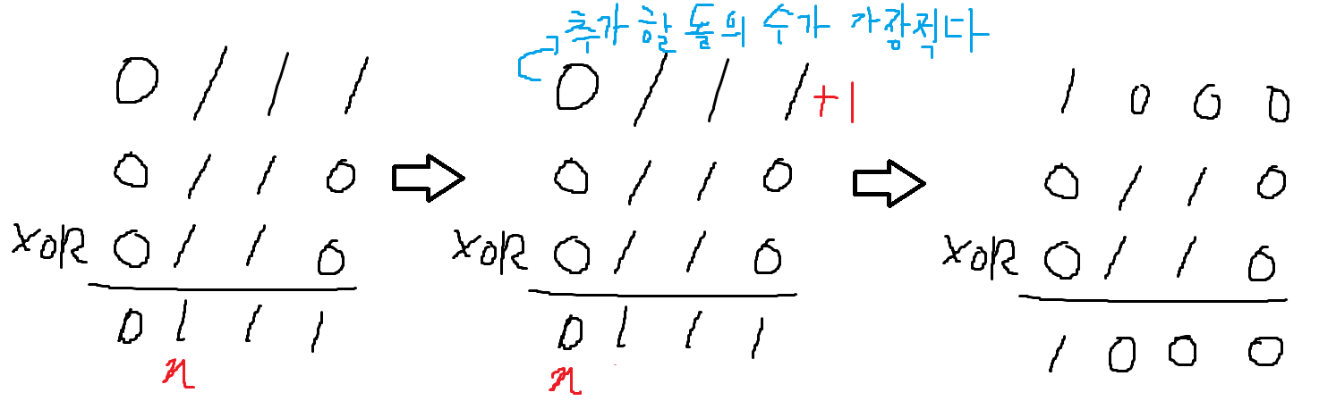 - 만약 n번째 자리가 0인 돌무더기가 없다면, n을 1 늘리고 n+1번째 자리가 0인 돌 무더기를 찾아 2번 방법을 적용한다.