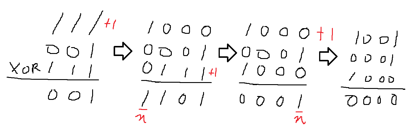 그러면 이전에 0을 1로 바꾼 방법을 똑같이 적용해 n+1번째 자리를 1로 바꾸는 가장 작은 수 b를 찾고 b를 더해 돌무더기의 n번째 자리를 0으로 바꿀 수 있다.