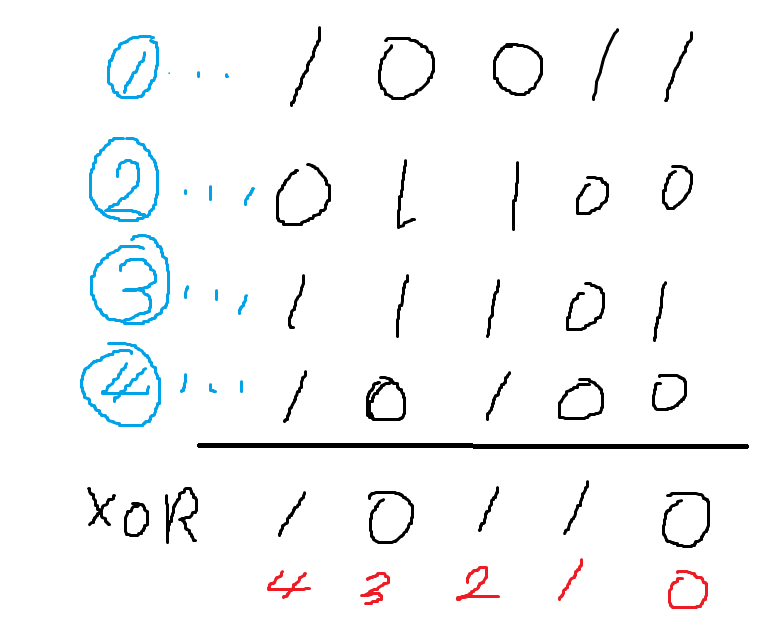 그러므로 후공인 지혜가 이기기 때문에 모든 돌 무더기를 xor값이 0이 되도록 만들기 위해 돌 무더기에 돌을 추가하는데, 이 때 추가해야하는 가장 적은 돌의 양을 계산하면 되는 문제다.