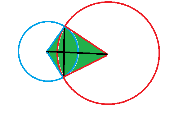 여기서 파란색은 부채꼴의 넓이이고, 초록색의 넓이는 빨간색 부채꼴 - [두 원의 중점사이의 거리] * [두 교점의 길이] / 2가 성립한다.