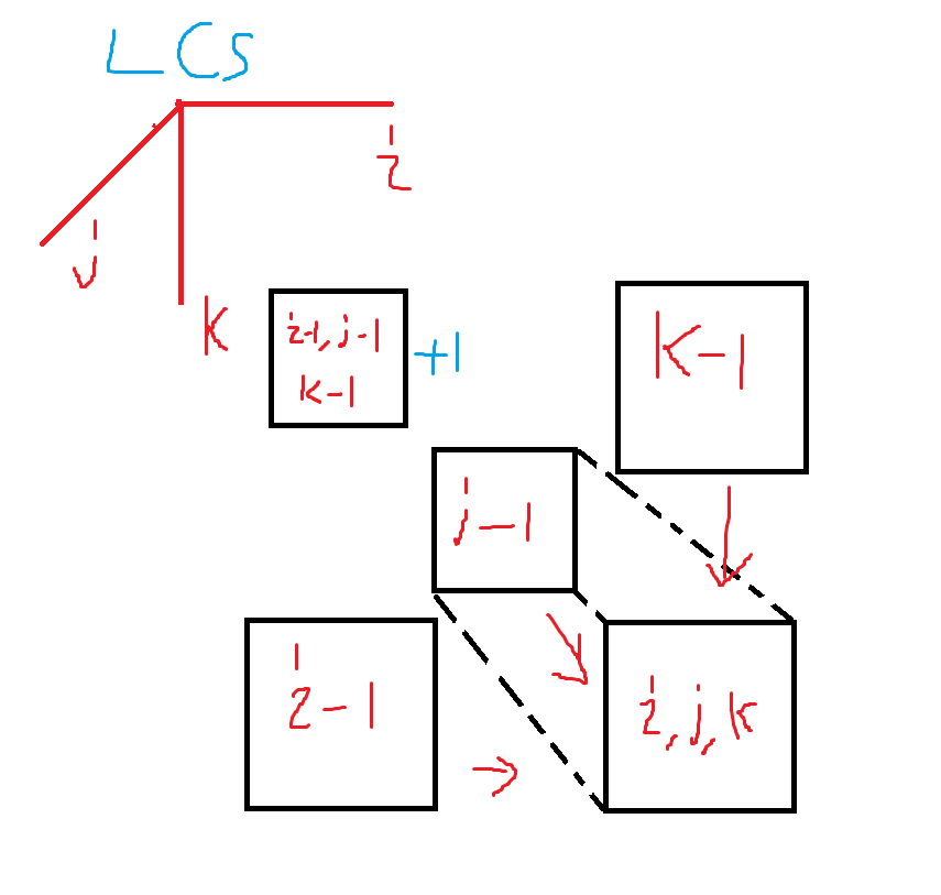 또한 항상 LCS[i][j][k]는 LCS[i-1][j][k], LCS[i][j-1][k], LCS[i][j][k-1] 의 값들 보다 크거나 같아야 된다.