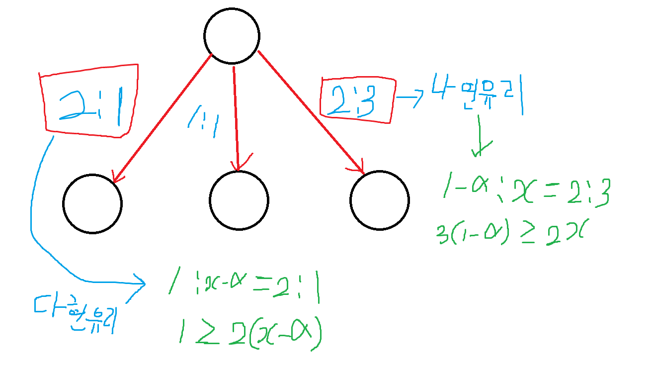 - DFS로 각 경로별로 나연이 무조건 이기기 위해 다현이 얼마의 돈을 가지고 있어야하는지 비율을 계산한다.