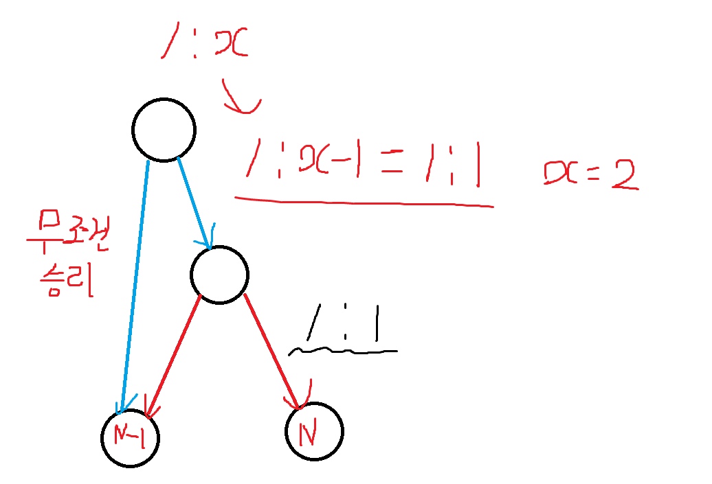 이때, 오른쪽으로 갔을 때도 나연이 이기려면 이동 후에 비율이 1:1을 유지하면 된다는 것을 알 수 있다.