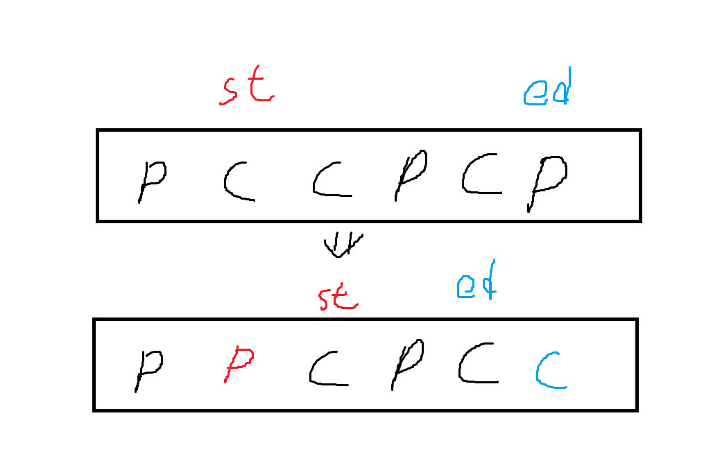 이때, 빠르게 계산하기 위한 아이디어는 앞에서부터 C를 찾았고 뒤에서부터 P를 찾아서 바꿨으므로 그 위치를 저장해 변환 연산을 할지 이전 위치부터 시작하면 된다.