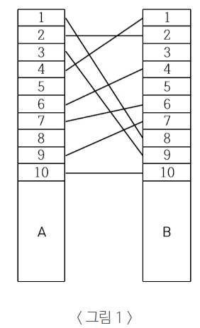 예를 들어, < 그림 1 >과 같이 전깃줄이 연결되어 있는 경우 A의 1번 위치와 B의 8번 위치를 잇는 전깃줄, A의 3번 위치와 B의 9번 위치를 잇는 전깃줄, A의 4번 위치와 B의 1번 위치를 잇는 전깃줄을 없애면 남아있는 모든 전깃줄이 서로 교차하지 않게 된다.