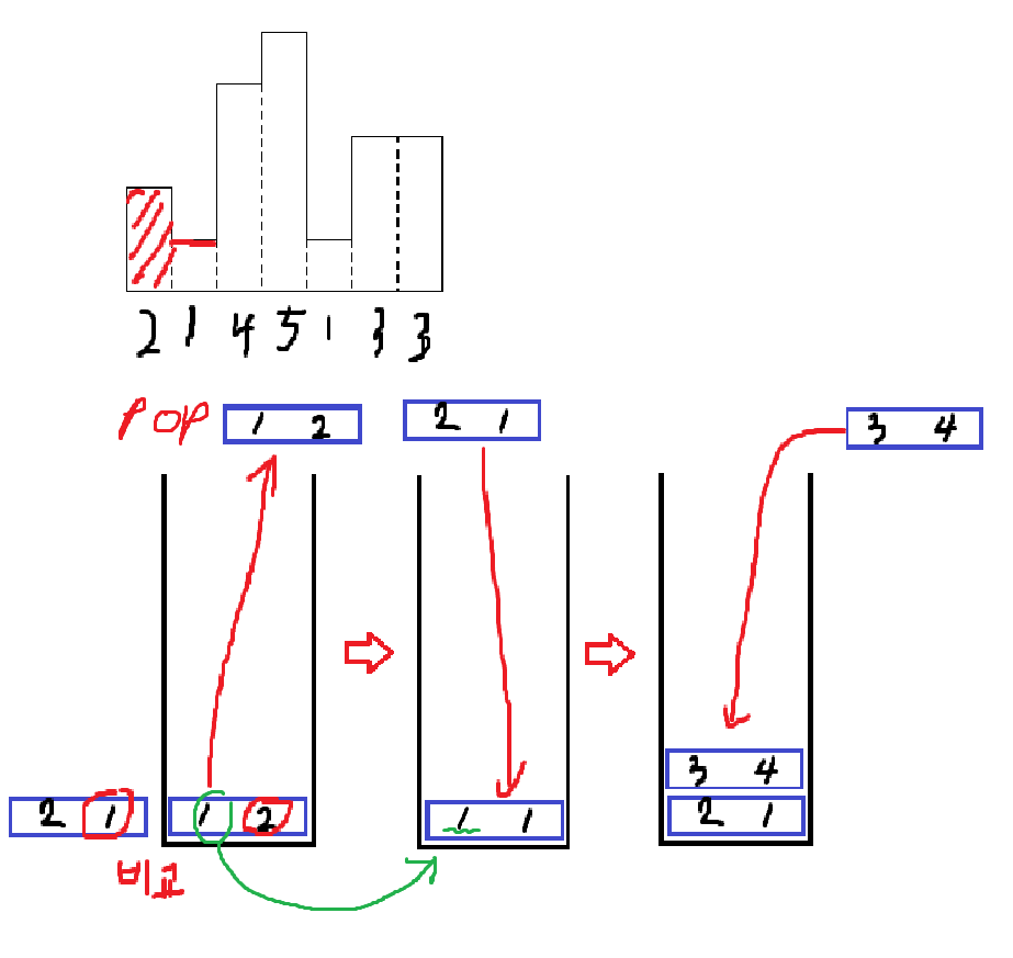 만약 작다면 stack에서 제거한 후 stack에 저장해둔 가로 위치부터 현재 블럭의 가로 위치를 뺀다음 stack에서 제거한 정보의 세로 높이를 곱해 최대값을 비교한다.