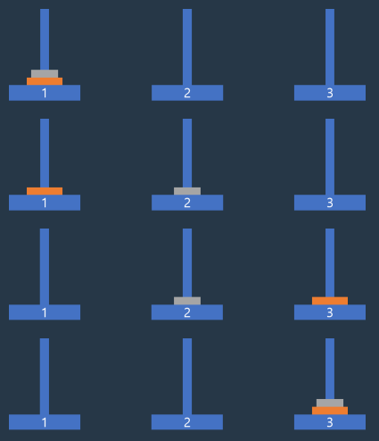 블록이 3개일 경우 2개의 블록을 1에서 2로 옮기고 3번째 블록을 1에서 3으로 옮긴 뒤, 다시 2번에 있는 2개의 블록을 3으로 옮기면 된다. 이를 표현하면 다음과 같이 표현할 수 있다.